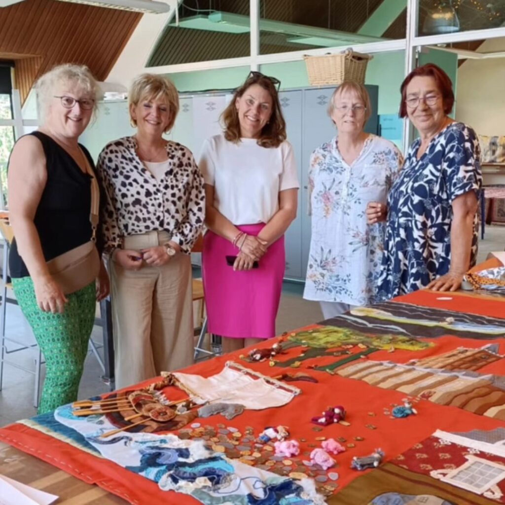 Ze bewonderen hier één van de stukken van het wandkleed Tiel. Het complete wandkleed vertelt de geschiedenis en ontstaan van Tiel. Alle technieken die gebruikt zijn en alle verschillende materialen maken dit wandkleed tot een uniek kunststuk.